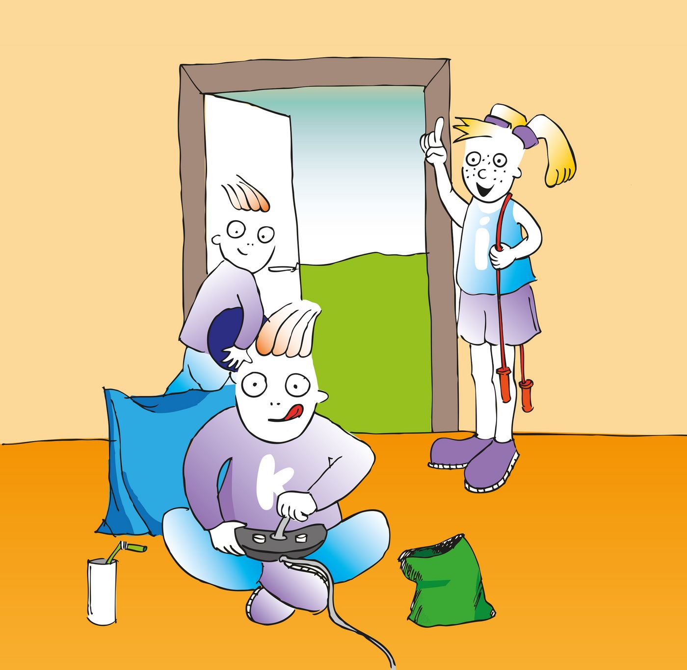 „Wie lange möchtest du noch hier drin vor der Spielkonsole sitzen?" "Nur noch dieses eine Level!" Konrad war so vertieft in den Bildschirm vor sich, dass er die Freundin und seinen Bruder gar nicht ansah. Karl setzte sich entmutigt auf einen Stuhl und baumelte mit den Beinen in der Luft.